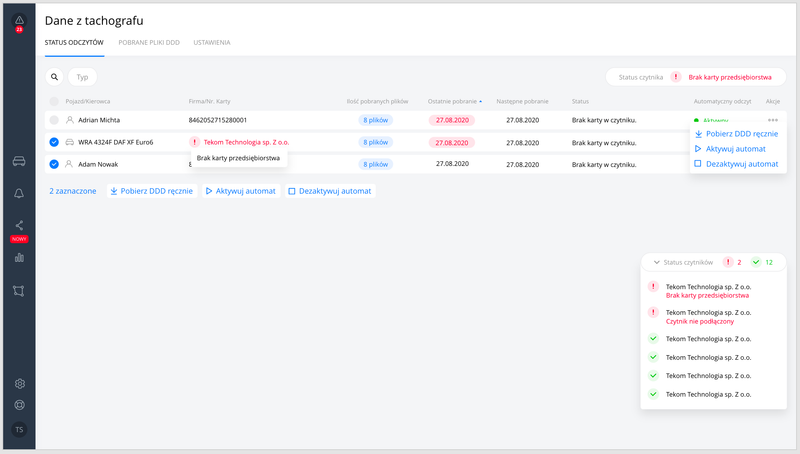 Rozbudowana aplikacja webowa do monitorowania pojazdów opracowana dla Tekom Technologia, umożliwiająca zarządzanie flotą obejmującą ponad 100 000 pojazdów dla około 20 000 klientów. Aplikacja dostarcza szczegółowych informacji o lokalizacji pojazdów, ich stanie technicznym oraz wydajności eksploatacji, znacząco ułatwiając codzienną pracę użytkowników. Intuicyjny panel administracyjny pozwala na efektywne zarządzanie i analizowanie danych flotowych w czasie rzeczywistym.